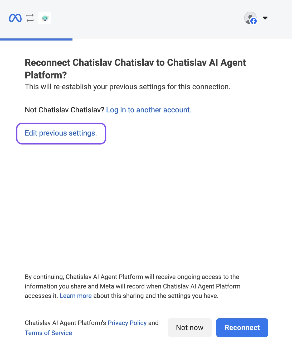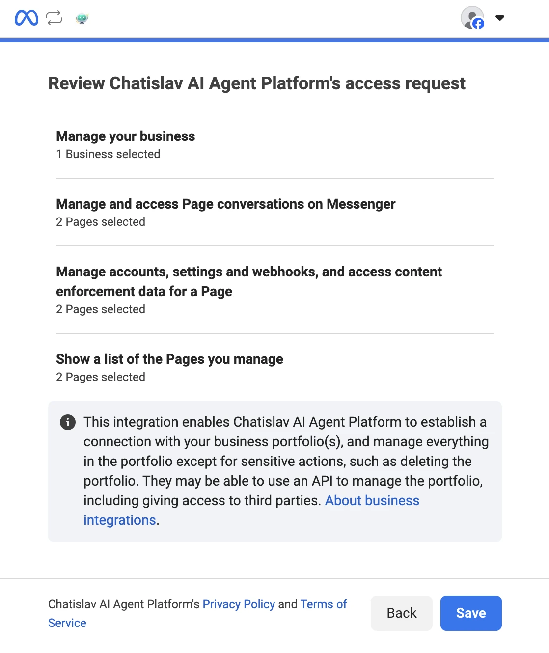 Facebook will now show you a final review of all the permissions Chatislav will have. You'll see a summary including: