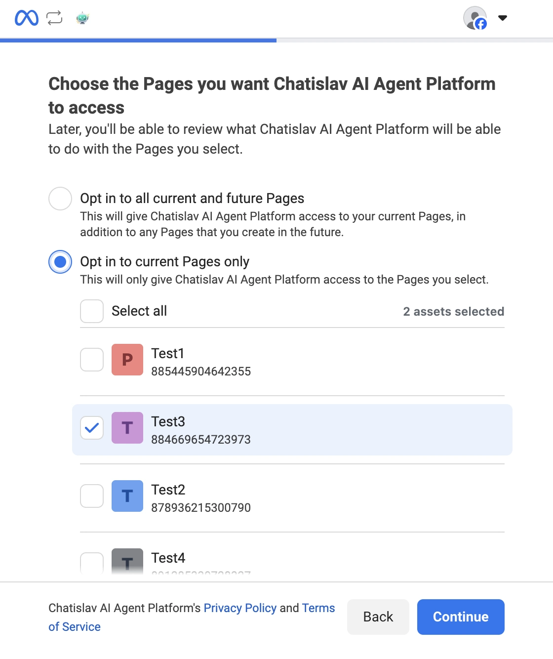 You'll see two options:- "Opt in to all current and future Pages" – automatically gives Chatislav access to all your current Pages and any Pages you create in the future