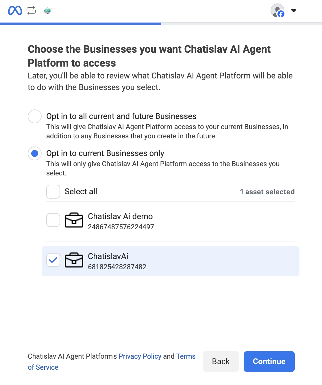 Similar to the previous screen, you'll see two options:- "Opt in to all current and future Businesses" – gives Chatislav access to all your current Business accounts and any new ones you create later