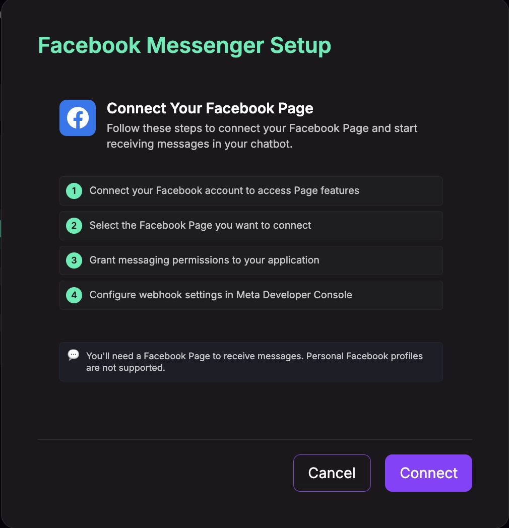 - Facebook Page: A Facebook Page that you manage (required for Messenger integration)