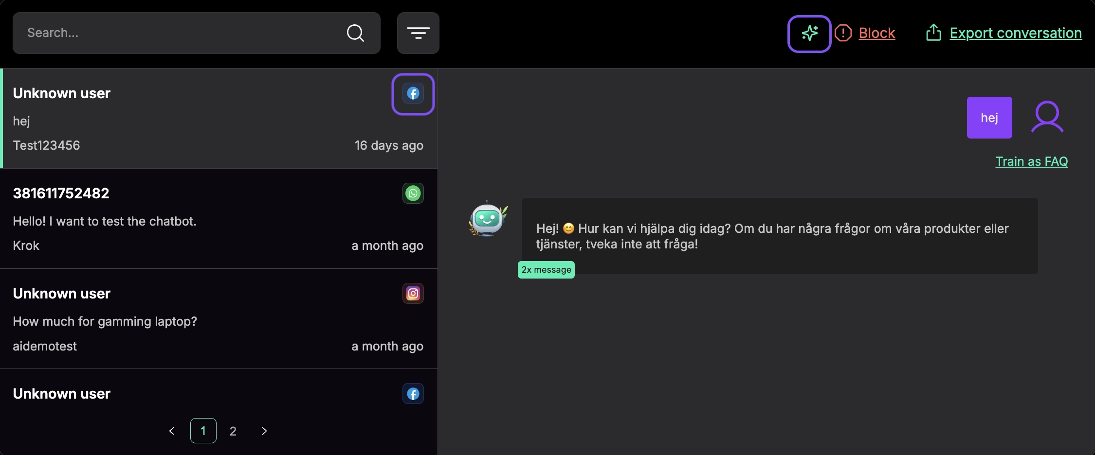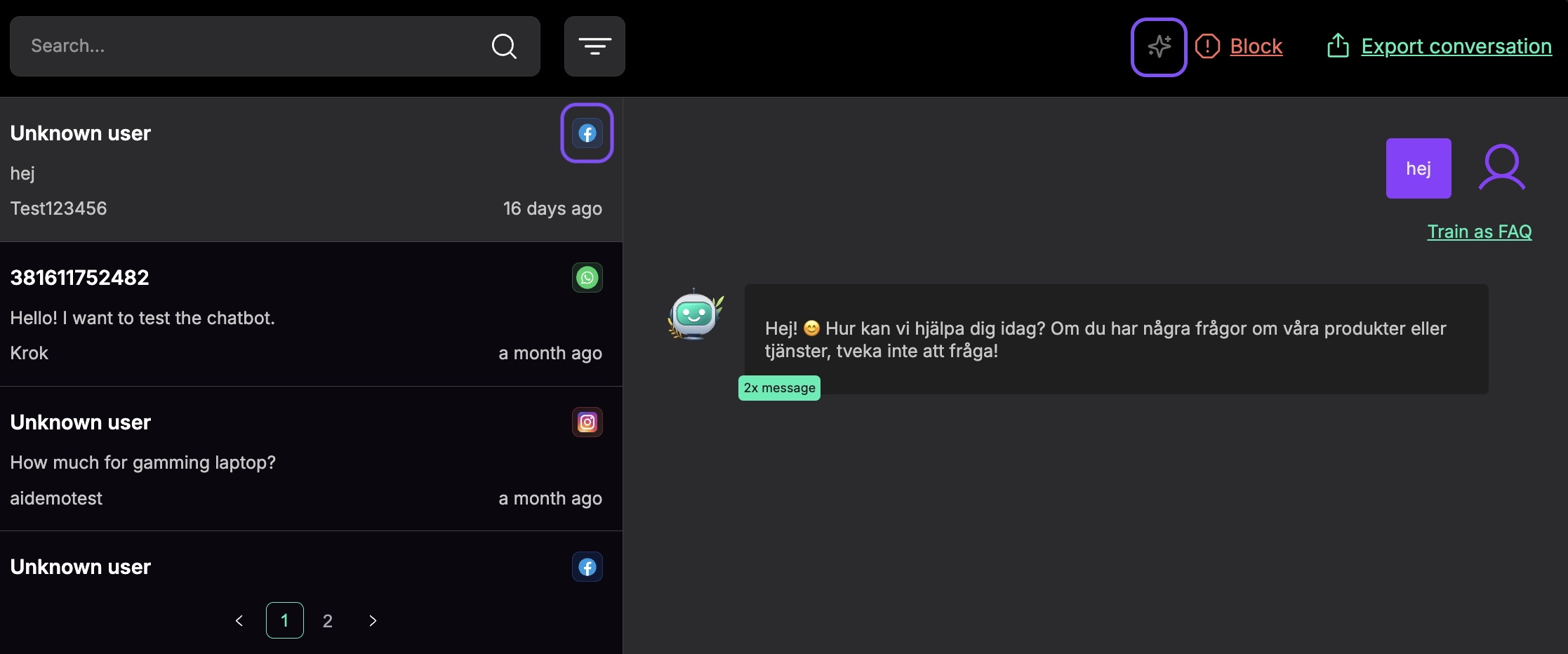 Note: If a Facebook Page integration is removed, you’ll still see past conversations in Chats, but human handoff may no longer be available for those threads because the underlying page integration is disconnected.