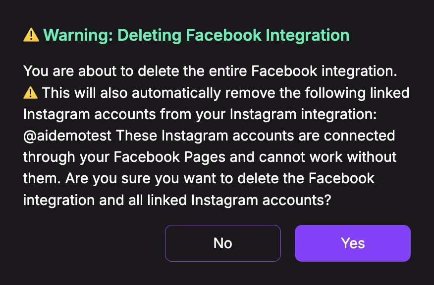 - When you delete a Facebook integration, Chatislav checks if any Instagram accounts are using those Facebook Pages